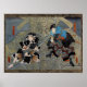 Kunisada, La encrucijada de Gappo Utagawa Kunisada/Toyokuni III (1786-1865) Ehon Gappo Ga Tsuji (Libro ilustrado de la encrucijada de Gappo) c 1850. Diptych Oban. Este diptych bellamente conservado de Kunisada representa lo que se ha descrito como "un drama kabuki de maldad sin restricciones". El kabuki de principios del siglo XIX fue dominado por el escritor Tsuruya Nanboku IV, quien creó un género de obras que se deleitaban con el melodrama sanguinario. Ehon Gappo Ga Tsuji es un excelente ejemplo de este tipo de juego kabuki a veces llamado drama kyogen. El complot está relacionado con la recuperación de una herencia familiar y la venganza por un asesinato cobarde. La escena ilustrada por Kunisada es del sexto acto: Myokakuji Omote no Ba (Frente al Templo Myo kaku). Vemos a dos actores en los roles de Yaegaki Monzo y Kageyama Shigenojo, luchando ante una enorme estatua de Emma Daio (el Rey del inframundo); es una imagen extraordinaria y sorprendente, la cara asquerosa que llena casi ambas sábanas y los actores representados en la pelea intermedia. La obra se presentó en el famoso teatro Kawarazaki en Edo en 1850. Probablemente a partir de 1850, la impresión es de tamaño completo, en buen estado con colores fuertes, y impresión temprana nítida, sin problemas de condición. Sin respaldo y se unió a la costura.