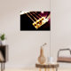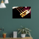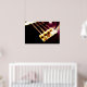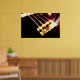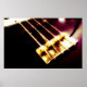 La fotografía abstracta original de este Poster de arte se centra en la base de una guitarra eléctrica de bajo, la parte donde las cuerdas comienzan y suben hasta el cuello. La coloración fotográfica más cercana se realiza en unos tonos cálidos y profundos, con una luz dorada sobre el plato metalizado, las cuerdas, los tornillos y los resortes.