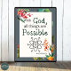 Eleva tu espacio vital en un refugio exuberante sin esfuerzo con una afirmación positiva del inspirador versículo de la Biblia, Mateo 19:26. Este verso dice: "Con Dios todas las cosas son posibles" El guión aparece sobre un fondo floral tropical. Este artículo es parte de nuestra colección de Citas de la Biblia Cristiana y puede ser comprado para inspiración personal o como regalo para un ser querido. En DigitalArtfulAvenue ofrecemos una amplia gama de personalizables y exquisitos artículos que se adaptan a sus preferencias.