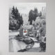 Este intrincado boceto de lápiz captura la serena belleza de un pintoresco pueblo enclavado a lo largo de un río suave. Se evoca un sentimiento de tranquilidad y elegancia intemporal. Las líneas detalladas crean un paisaje texturado, desde los árboles exuberantes y altísimos en el fondo hasta el agua rizada que refleja el cielo. Las casitas de campo, con sus tradicionales tejados de tejas y sus pequeñas ventanas, bordean un sinuoso camino que bordea el río. Un toque cálido de color rojo naranja de las macetas de flores de una de las casas le da un toque sutil de vida y calidez a la escena por lo demás monocromática. Esta pieza sería una adición perfecta a una pared de una galería o como punto focal independiente. Ideal para los espacios que acogen una estética clásica, acogedora y de inspiración natural.