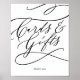 Esta caligrafía romántica florece con las tarjetas y el signo de los regalos es perfecto para una simple ducha de boda o de novia. El moderno diseño clásico presenta vistosos remolinos y florituras con una preciosa y elegante tipografía con letras a mano. La línea de texto al final del cartel puede ser personalizada con la fecha, los nombres de la novia y el novio, o un mensaje corto como "Gracias". Este signo se puede usar para un boda o para cualquier evento o fiesta.