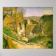 La casa del hombre ahorcado, Auvers-sur-Oise. Paul Cezanne. Un bonito paisaje de tonos verdes fríos. A lo largo de la carretera que baja hay grandes casas con techos verdes. Hay grandes árboles cerca de la casa. Cielo púrpura pálido con nubes. Reproducción de obras famosas de imágenes artísticas de dominio público.