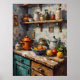 Esta pintura representa una acogedora cocina rústica llena de varios elementos en un arreglo de vida. El arte se caracteriza por su textura de gran desgaste, con pinceles gruesos y expresivos sobre todas las superficies, desde los gabinetes en apuros hasta las paredes estampadas. Dos estanterías de madera albergan una gran variedad de macetas y jarras de cerámica, mientras que el mostrador de abajo está decorado con una olla de naranja brillante, un bol de cítricos y una tetera de plata. El cuadro evoca un ambiente cálido y acogedor, con un ambiente encantador y vintage.