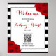 La colección de bodas chic moderna y lujosa presenta un fondo clásico a rayas negras y blancas acentuado con hermosas rosas rojas rubí y un marco de lámina de plata falsa. Esta señal de bienvenida es fácil de personalizar y será la señalización perfecta para cualquier boda, fiesta de despedida de soltera, fiesta de cumpleaños, celebración de compromiso o cualquier otra ocasión especial. El texto del modelo y el código QR son fáciles de personalizar para hacer que esta señal sea única para su evento especial.
