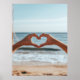 Dos manos se unen para formar un corazón frente a una playa tranquila que simboliza el amor, la conexión y la tranquilidad junto al mar
