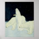 Ilustracion vintage de la doncella de nieve reuniendo corazones rotos. Es la reina de las vastas regiones de nieve, y cuando la luna es brillante, deja su castillo de hielo y deambula por el desierto de blanco en busca de todos los desterrados y rotos corazones. Lleva tres corazones en las manos y a su lado dos grandes osos polares como guardianes. Ilustracion de Edmund Dulac. Imágenes de HTM