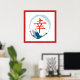 El colorido ilustracion cuenta con el centro de caligrafía japonés "Happiness" con corona azul grúa, fondo blanco y borde rojo.