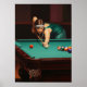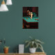 Una sofisticada pintura al óleo Art Déco que capta un destello de moda en un lustoso vestido verde esmeralda, su forma geométrica estilizada definida por la iluminación teatral de claroscuros mientras se concentra en un difícil tiro de billar.