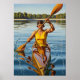 Una serena pintura al óleo Art Déco que representa un fuerte piragüismo en una brillante y soleada cúpula amarilla, su forma geométrica estilizada, definida por la luz fresca de la mañana mientras rema por el agua tranquila azul-verde.