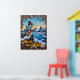 Esta obra de arte imaginativa muestra un tiburón, sorprendentemente adornado con un sombrero de punta y gafas de sol rojas, que tambalea apasionadamente una guitarra eléctrica. Está situado en un acantilado de montaña con nevadas, frente a un inmenso mar azul esparcido por el hielo y enmarcado por picos lejanos. Las gruesas y deliberadas pinceladas del cuadro le dan una textura palpable al paisaje helado, haciendo que la declaración "ROCK y ROLL" realmente destaque.
