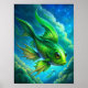 En la imagen, un vibrante pez verde nada con gracia a través de un brillante cielo azul, desafiando las leyes de la naturaleza. Las escalas de los peces brillan a la luz del sol, reflejando los tonos de esmeralda y lima. Sus aletas se extienden a lo ancho, creando una sensación de movimiento y elegancia a medida que se desliza por el aire. Las nubes blancas onduladas se desprenden del fondo, lo que realza el ambiente surrealista de la escena. La combinación de los peces y el cielo crea una imagen caprichosa y encantadora, invitando a los espectadores a imaginar un mundo donde todo sea posible.