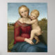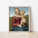 La Pequeña Madonna de Vino (1505) de Rafael es una obra maestra del Renacimiento que representa a la Virgen María de manera ordenada sosteniendo al Niño Cristo en un paisaje sereno. La pintura ejemplifica el estilo característico de Raphael, caracterizado por un modelado suave, una composición armoniosa y frágiles transiciones de color. María, vestida con un vestido rojo con un manto azul, mira con suavidad al espectador mientras el niño Jesús se sienta cómodamente en su regazo, simbolizando el amor materno y la gracia divina. El tranquilo paisaje de fondo realza el sentido de paz y belleza natural de la pintura, reflejando la influencia de Leonardo da Vinci y la profunda devoción de Rafael a los temas religiosos. Utilice las herramientas de diseño para agregar texto personalizado o personalizar la imagen.