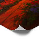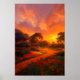 El lienzo representa un paisaje impresionante de un mar escarlata de flores que se extiende hasta el infinito, bajo la cubierta de una puesta de sol húmeda y turbia. El sol brillante quema el cielo con ardientes tonos de naranja y amarillo, arrojando su cálida luz sobre el sinuoso camino que conduce a través del campo de flores. El sendero atraviesa el mar de flores de cardenales, creando un contraste sorprendente con la vegetación de los árboles lejanos. La escena evoca una sensación de nostalgia, como si se estuviera recorriendo el camino de la memoria hacia un horizonte distante, acompañado sólo por el ruido de las hojas y los susurros del viento.