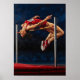 Una dramática pintura al óleo Art Déco captura a una mujer de alto salto en el ápice de su salto, su forma estilizada y geométrica en un vibrante conjunto de bermellones arqueado elegantemente sobre el bar contra un cielo índigo profundo, iluminado por una luz claroscuras estelar y teatral.