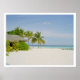 Fotografía de la tranquila y relajante playa de Las Maldivas, con un bungalow, palmeras, arena y océano.