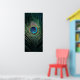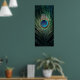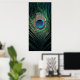 La luz purpurinas de la oscuridad de la pluma de pavo real en esta fotografía de la vida muerta. El fondo verde oscuro hace que el ojo de la pluma de guijarros parezca impresionante.