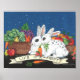 Este alegre poster presenta mi original obra de arte con derechos de autor titulada "La vida es un banquete", y muestra una colorida escena de frutas, verduras y conejitos.