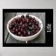 Fotografía de cerezas con fondo negro con la palabra "Vida" impresa a la derecha.