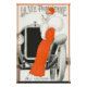 Portada de una revista vintage de arte deco de 1922 de Rene Vincent. Una mujer que es chofer de su elegante auto, está vestida con un abrigo rojo de piel y un gorra está ajustando su lápiz de labios mientras descansa en el guardabarros del auto.