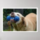 Fotografía de un laboratorio amarillo con un juguete en la boca.