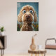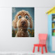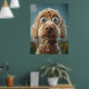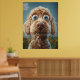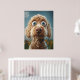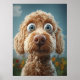 Un adorable labrador australiano con piel de rizo y ojos enormes y expresivos, sorprendido en un colorido entorno exterior.