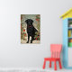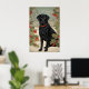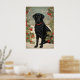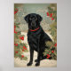 Un Labrador Recuperador negro se sienta en una escena de invierno nevada, enmarcado por ramas huecas con bayas rojas. El perro tiene un collar rojo y mira directamente al espectador con una expresión tranquila y digna. El fondo está formado por un bosque nevado con ramas desnudas y una paleta de colores mullidos y mullidos. La imagen evoca una sensación de tranquilidad y belleza del invierno.