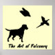 Silhouette de un labrador y un halcón trabajando juntos como uno. Las palabras El arte de la Falconería abajo.