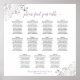 Esta tabla de asientos de 11 mesas es a la vez sencilla y elegante, con un fondo blanco y gris oscuro y un texto morado claro o lavanda. El diseño presenta un título de caligrafía de escritura de lacy con un filigree decorativo de plata de Relieve metalizado falso en las esquinas. Elegante, moda y sofisticada manera de ayudar a sus huéspedes a encontrar sus asientos en la recepción de su boda. Incluye mesas para 110 comensales con 10 asientos por mesa.