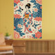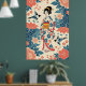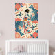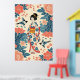 This image is a vibrant and stylized illustration featuring a woman in traditional Japanese attire, specifically a kimono patterned with large floral and leaf motifs. The overall style is strongly reminiscent of Ukiyo-e woodblock prints, but with a modern, cleaner aesthetic, and a color palette that suggests Bingata dyeing from Okinawa.