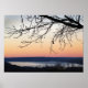 Este elegante afiche de viajes con fotografías artísticas muestra las vistas desde una colina al sur del lago Cayuga, el más largo de los glaciales lagos Finger de Nueva York. La ciudad de Ithaca se encuentra en el extremo sur. Es el lugar perfecto para contemplar esta impresionante puesta de sol. El cielo brilla con colores brillantes de naranja, rosa, amarillo, crema, azul y violeta. Las colinas de silueta bordean la orilla oriental. Una rama baja domina el primer plano y enmarca esta hermosa escena.