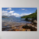 El Parque Nacional Glacier tiene muchos hermosos lagos, y el Lago McDonald es uno de los más fácilmente accesibles. Aquí hay una vista del lago por la mañana con el sol recién saliendo y una silueta de rocas apiladas.