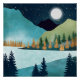 Un hermoso paisaje con texturas únicas que muestran un paisaje de lago montañoso con una luna en alza y un cielo estrellado en tonos azules, dorados, verdes y turquesas.