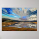 Diseño artístico de un lago con el dramático cielo reflejado en el agua del lago. Las colinas y los campos rodean el lago.