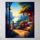 Warm lantern light glows across a secluded terrace overlooking tranquil waters and distant mountains. Surrounded by lush foliage, ornate architecture, and inviting textures, the scene captures a quiet moment of comfort and beauty at day’s end. The interplay of golden light and cool blue tones creates a peaceful, intimate atmosphere, evoking a sense of retreat, reflection, and timeless elegance.