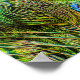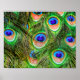 Impresión con un acercamiento de las hermosas cucharadas de ojos brillantes en un tren de pavo real, destacando los detalles irrisorios de verde, azul y bronce de estas plumas de cola. La decoración de las paredes es única y bonita para los amantes de las aves y la naturaleza. Foto tomada en Arcadia, California.