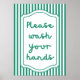 Añada un toque de elegancia a su cuarto de baño con este verde azulado cartel de impresión verde con una cita de Please Wash Your Hands. Este poster es perfecto para añadir un recordatorio elegante para mantener las manos limpias.