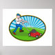 Illustration of landscaper gardener pushing lawn mower smiling facing side done in cartoon style on isolated white background.