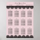 Infórmele a los huéspedes de su boda dónde están sentados con este poster de la tabla de asientos. Presenta mis ilustraciones de encaje negro sobre un fondo rosa suave. El título "Encuentra tu asiento" está en la parte superior. Debajo se muestran los nombres de la novia y el novio, la fecha del boda y la ciudad y el estado del boda. Además, cada mesa está reservada para los huéspedes.