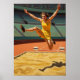 Una dinámica pintura al óleo Art Déco que capta a una mujer que salta en la extensión de su pico, su poderosa forma geométrica estilizada que se eleva por el aire, definida por una dura iluminación claroscuro contra un fresco y abstracto fondo estadio.