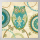 © Veronique Charron / Wild Apple. Una imagen con motivos de un búho con patrones circulares. En la imagen también se aprecia un fondo floral de color marrón.