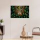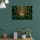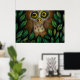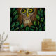 Una linda lechuza marrón con grandes ojos amarillos redondos se esconde entre las acogedoras hojas verdes de una treetop