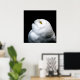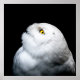 Fotografía de retrato de una hermosa lechuza nevada blanca con ojos amarillos sobre fondo negro.