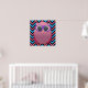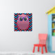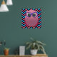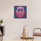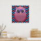 Adorable poster con un lindo búho rosado, con gafas moradas y sentado sobre un patrón de chevron de zigzag rosa y azul
