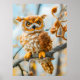 Un búho de fieltro bellamente confeccionado encaramado en una rama robusta, mostrando detalles intrincados de plumas y una expresión sabia. La textura hecha a mano le aporta calidez a esta escena de bosque.