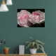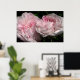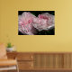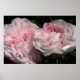 Leda es un rosa antiguo de Damask que data de principios del siglo XIX. Los pétalos son muchos y varían en color de flor a flor. Rosa cremoso y a menudo teñida de rosa más oscuro, también se le llama Damasco de Otoño o Damasco pintado. Este poster muestra dos flores de aroma rosado ruborizantes.