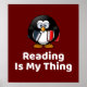 Un pingüino lindo y gracioso de "Leer es mi cosa" sosteniendo sus libros.