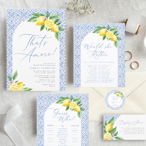 Adivinen cuántos besos para la futura señora. El juego de la ducha nupcial con este poster de ducha de azulejos azules inspirado en el limón Positano.