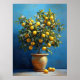 A lush lemon tree bursting with ripe golden fruit and tiny white blossoms stands in a rustic clay pot. The textured blue background and sunlit tile floor create a vibrant Mediterranean ambiance. Glossy green leaves and painterly brushstrokes add a lively charm.