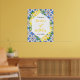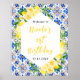 This fun and whimsical welcome sign features watercolor citrus lemons and foliage on a Mediterranean tile background. The text combines handwritten script and serif fonts for a stylish and modern look. This is perfect for a summer rustic birthday.