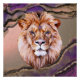 Una majestuosa cara de león se representa con unos ojos azules brillantes y una joya decorativa en la frente, colocada sobre un fondo de tonos tierra agitados. La forma del león es muy detallada, creando una sensación de regalidad y poder.